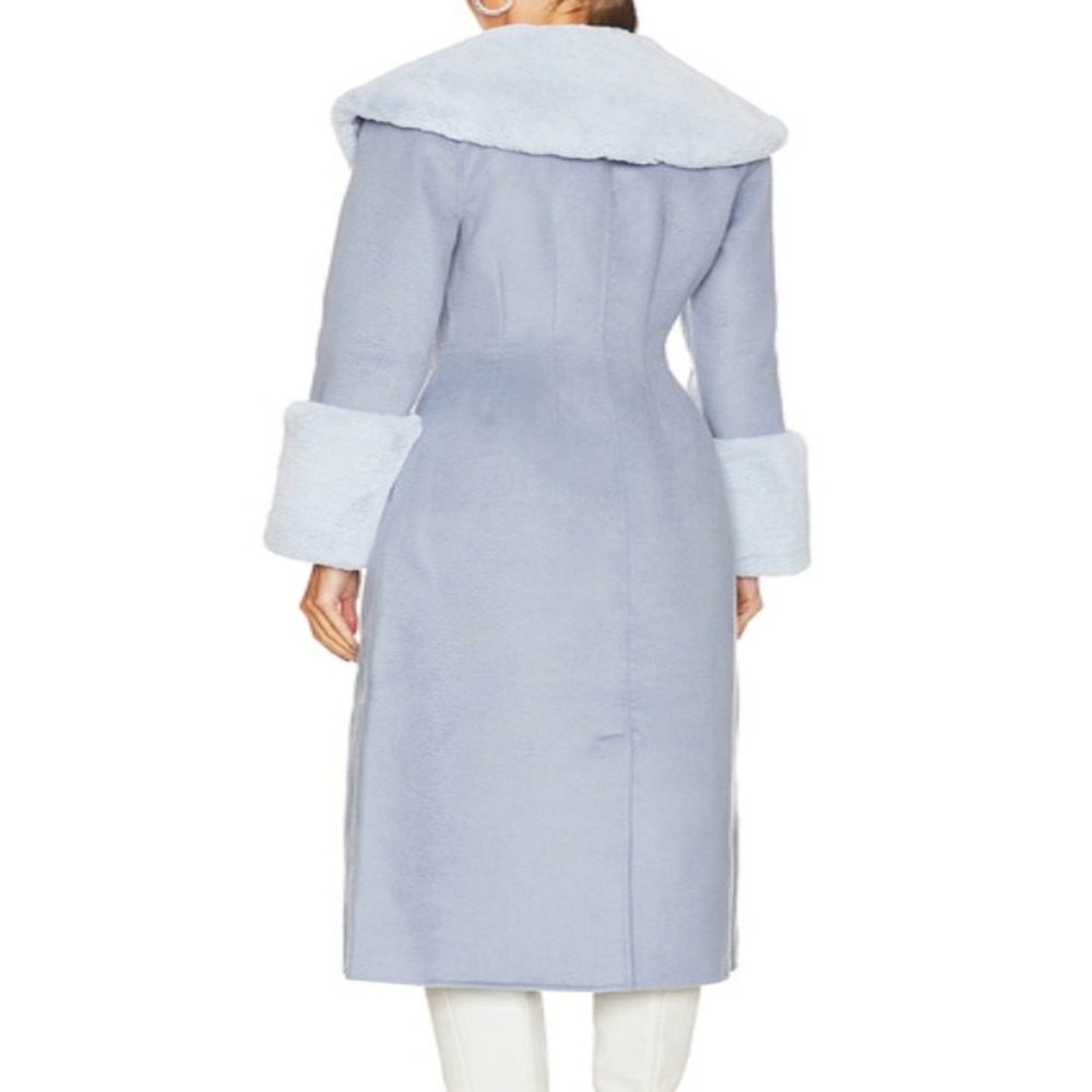 This coat gracefully merges functional elegance with fashion-forward detail. The blue wool-blend base offers structured warmth, while the faux fur collar and cuffs add an indulgent flourish. The viscose lining ensures comfort, and the zip-up design gives it modern polish. With thoughtful pocket placement, it’s as practical as it is stylish—ideal for television appearances or chic winter outings.