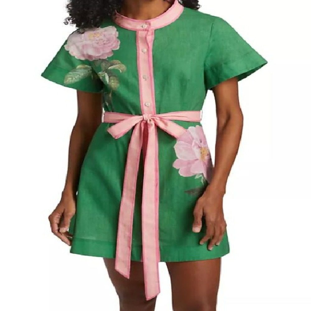 Featuring a mini shirtdress design, it comes with a button-front closure, short sleeves, and a refined band-style collar, giving it both structure and versatility. A self-tie belt accentuates the waist, completing the look with a flattering, tailored finish.