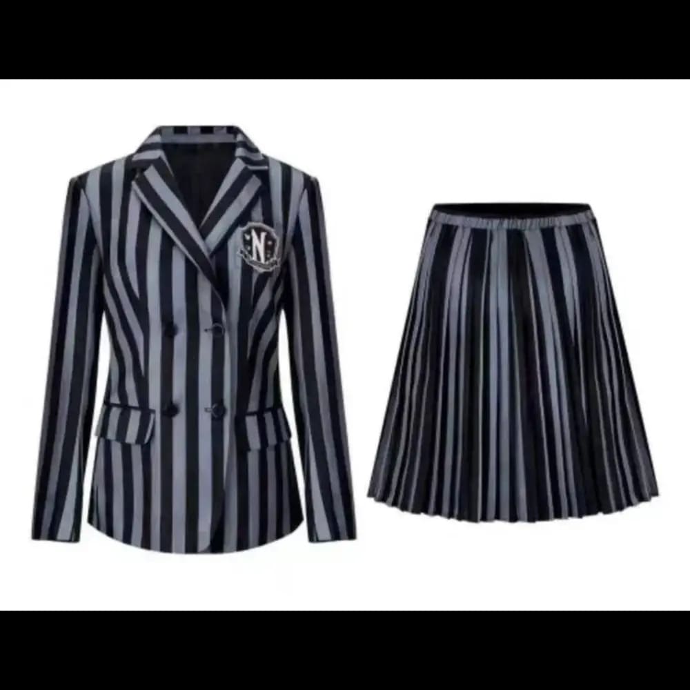 Crafted with precision and high-quality materials, this outfit combines sophistication with comfort. The blazer is tailored from premium suiting fabric in deep black, featuring a classic notch lapel, button fastening, and the option to include the distinctive Nevermore Academy crest. The crisp white shirt adds sharp contrast, maintaining the traditional school look while emphasizing Wednesday’s dark charm. Paired with a black pleated skirt, the ensemble delivers both authenticity and comfort, making it ideal for cosplay, themed events, or simply embracing the gothic schoolwear vibe.